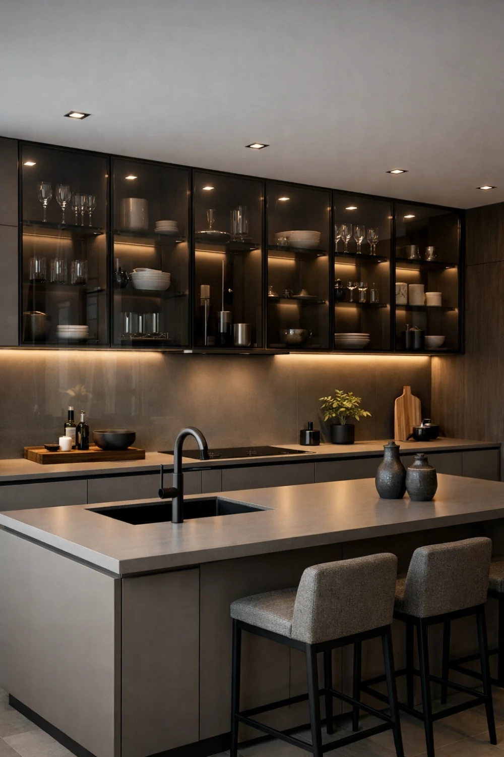 Tinted glass shutters pair beautifully with matte cabinets, metal accents, and modern lighting.