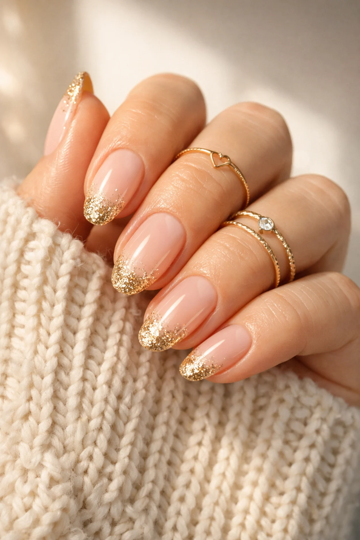 A soft ombré base blended into gold glitter tips creates a subtle and graceful manicure with a hint of sparkle.