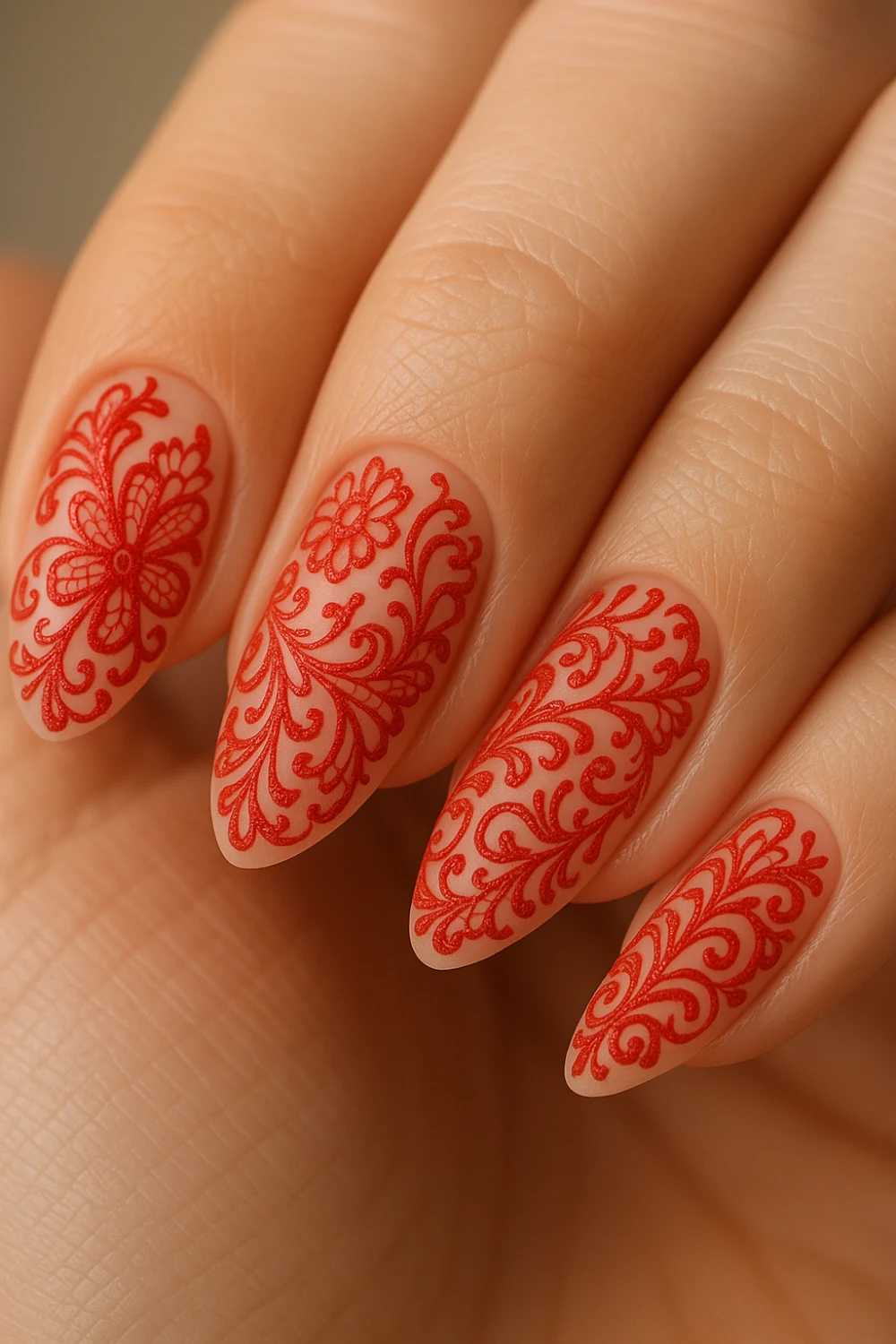Intricate lace-inspired red patterns painted over a sheer or pale pink base create a delicate and romantic manicure.